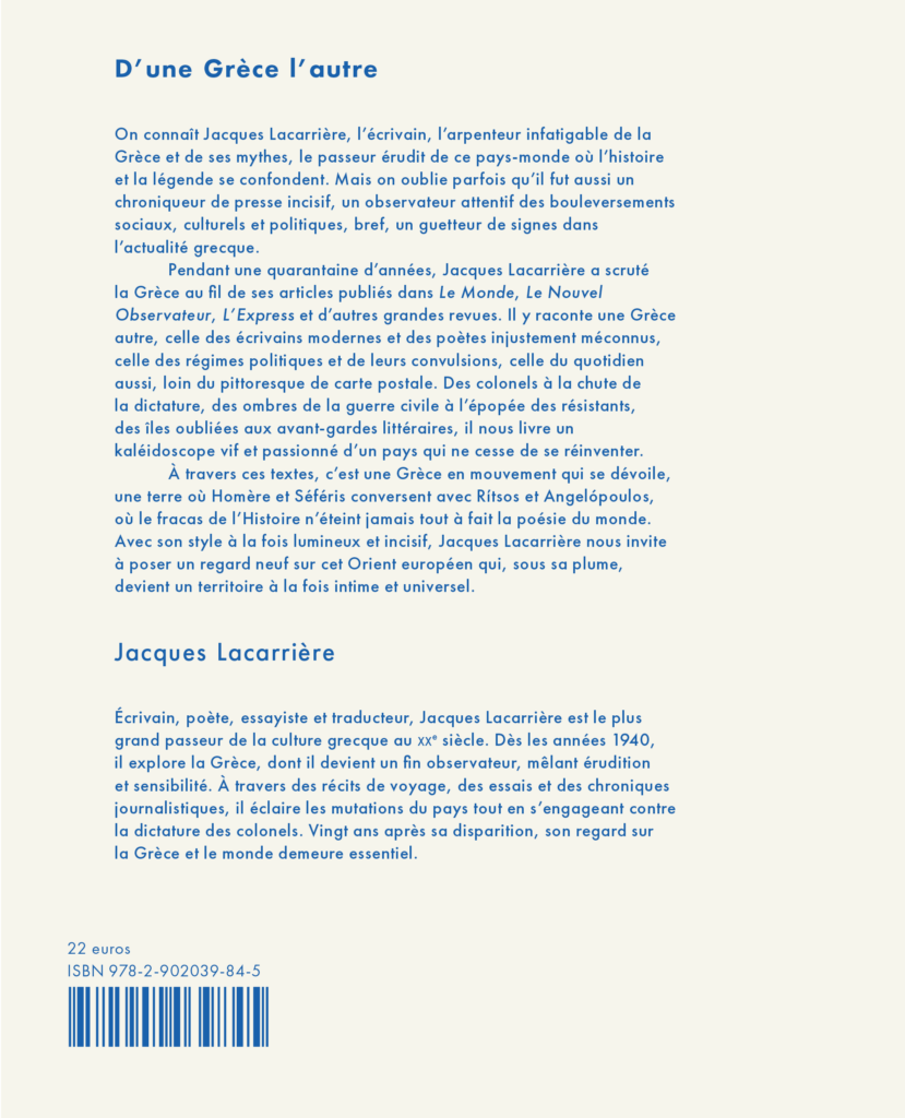 Pendant une quarantaine d’années, Jacques Lacarrière a scruté la Grèce au fil de ses articles publiés dans Le Monde, Le Nouvel Observateur, L’Express et d’autres grandes revues. Il y raconte une Grèce autre, celle des écrivains modernes et des poètes injustement méconnus, celle des régimes politiques et de leurs convulsions, celle du quotidien aussi, loin du pittoresque de carte postale. Des colonels à la chute de la dictature, des ombres de la guerre civile à l’épopée des résistants, des îles oubliées aux avant-gardes littéraires, il nous livre un kaléidoscope vif et passionné d’un pays qui ne cesse de se réinventer.